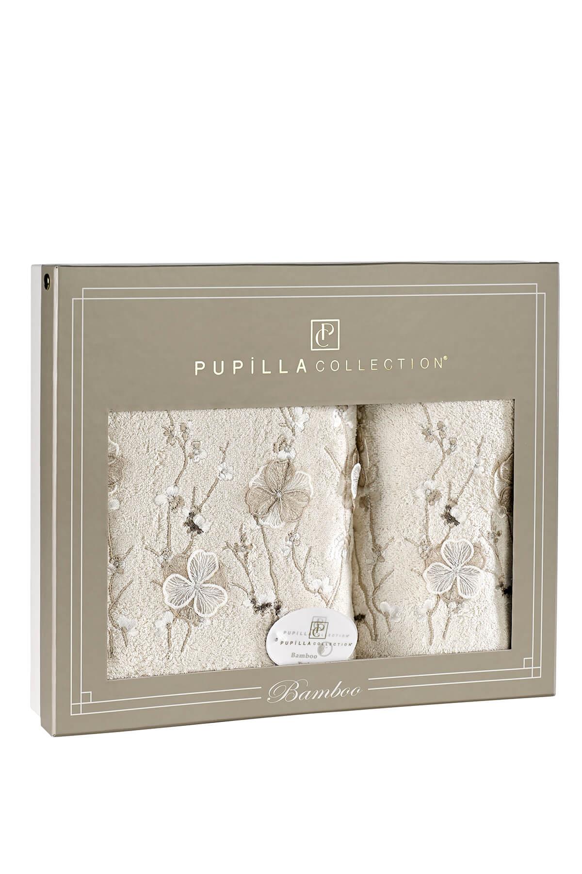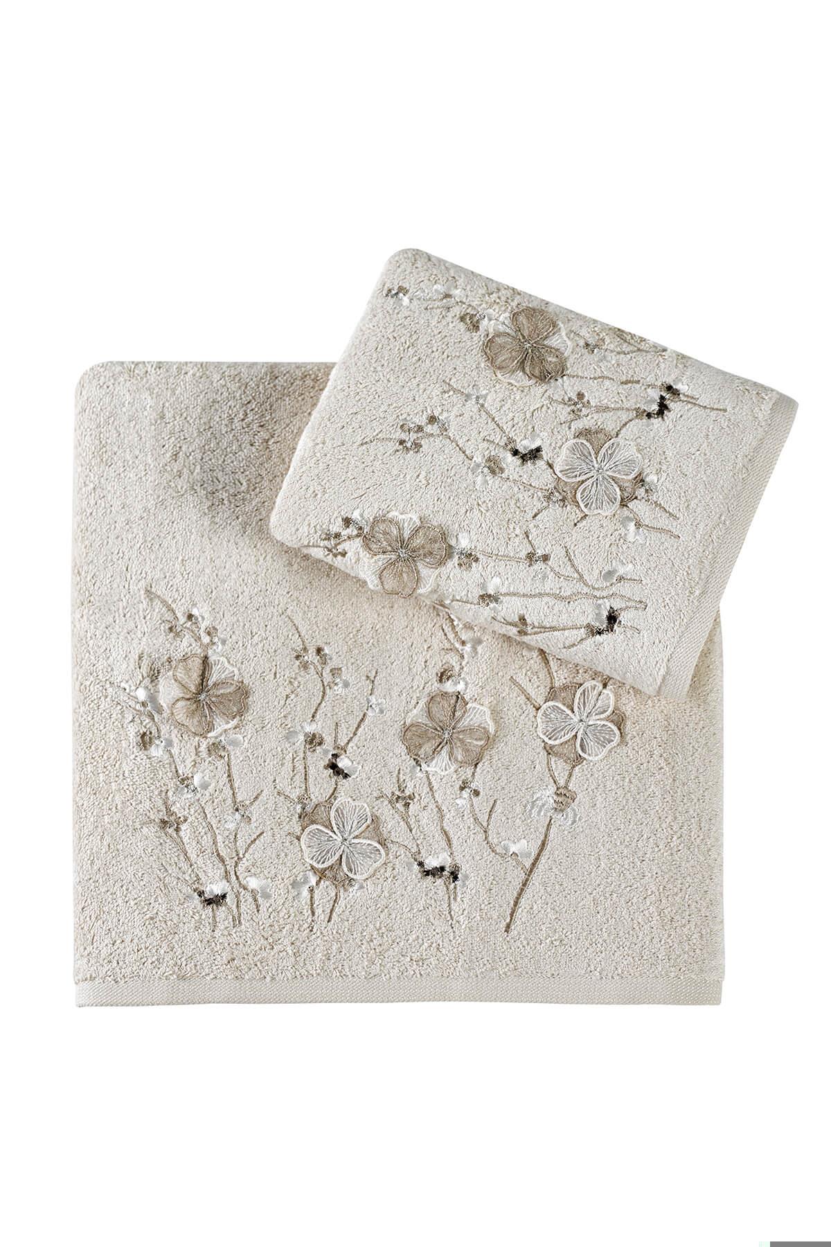 Lizaro Bambu 3 Boyutlu Nakışlı 2Li Banyo Havlu Seti (50*90+70*140) -Krem
